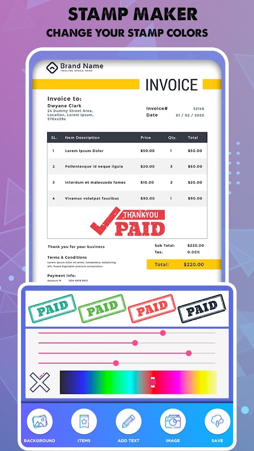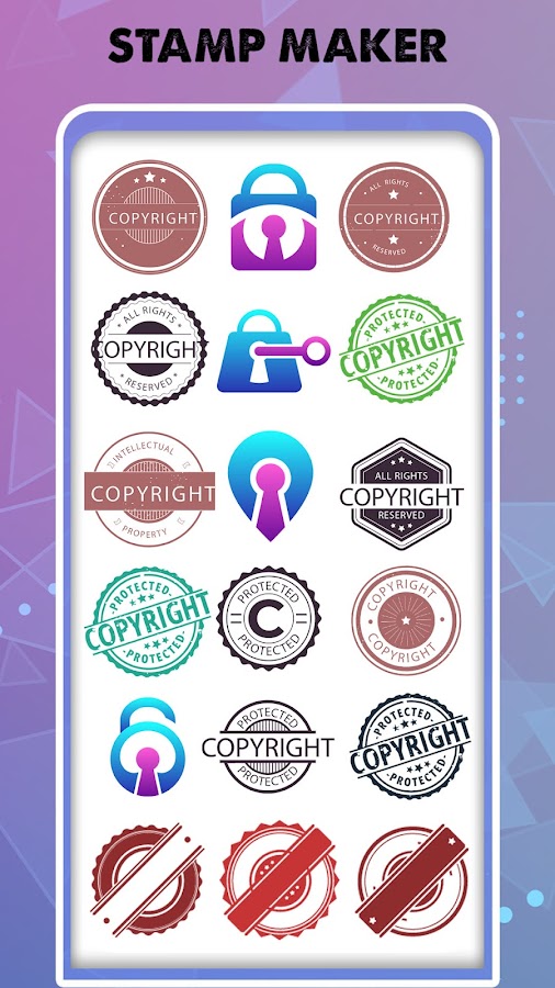 Приложение Stamp Maker позволяет создавать персонализированные штампы и водяные знаки на фотографиях, защищенных авторскими правами. Сохраните ваши важные произведения искусства от несанкционированного использования. Коллекция готовых штампов, возможность добавления текста и множество настроек. Вы можете настроить текст, вращать, переворачивать и удалять. Лучшее приложение для создания цифровых печатей. Добавьте наклейки из огромной коллекции наклеек и различные образцы штампов, чтобы сделать ваши цифровые документы аутентичными и профессиональными.