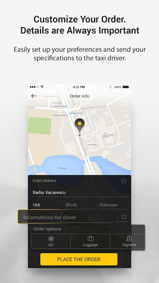 • Выбирайте такси по своему усмотрению, просматривайте его в режиме реального времени на карте, когда оно вам подходит, и вы получаете уведомление о его прибытии.