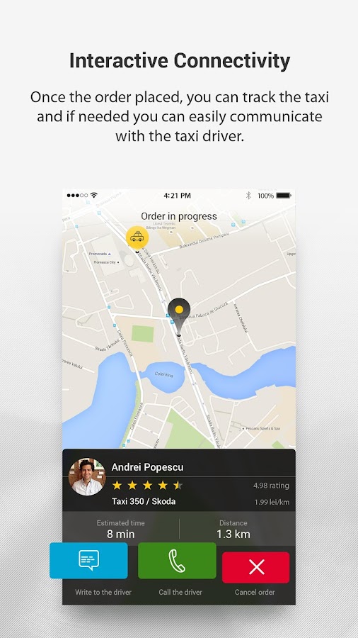 • Вы общаетесь напрямую с водителем такси посредством чата / звонка.