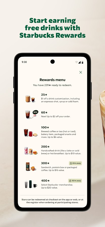 Для получения эксклюзивных преимуществ и использования функций приложения необходимо быть участником программы Starbucks Rewards.