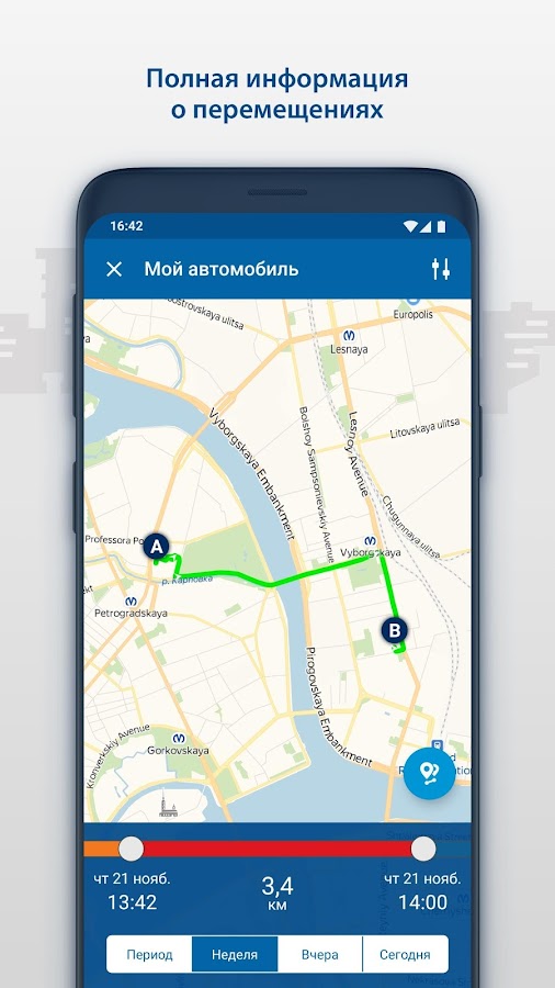 — (*) Полноценный мониторинг с отображением треков. Просматривайте треки, общую длину маршрута, скорость на отрезках пути