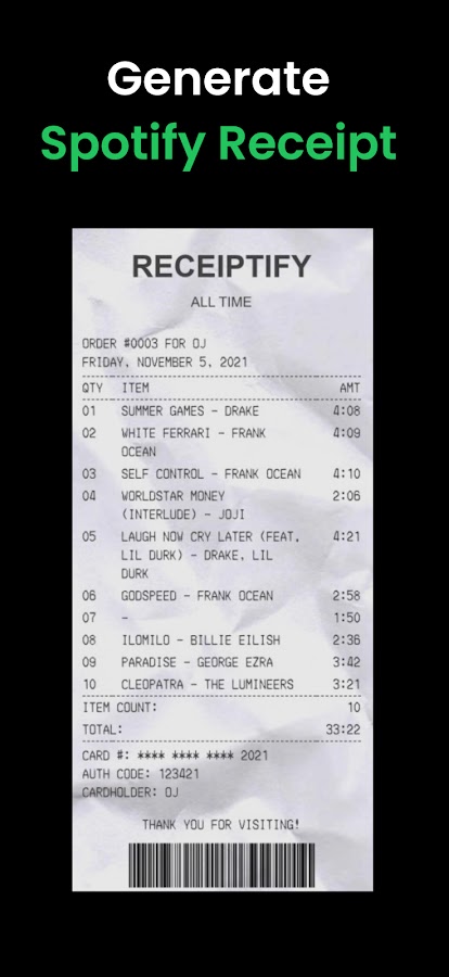 🔥 Скачивайте Receiptify прямо сейчас и исследуйте свою музыку! Наше приложение даёт персональные музыкальные инсайты, похожие на другие популярные сервисы, такие как Spotistats, must.fm, stats.fm, snd.wave, superfan, Receiptify Heroku и др.