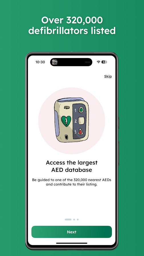 → Самая большая база данных AED в мире: вы можете добавлять, редактировать и сообщать о ближайших дефибрилляторах.