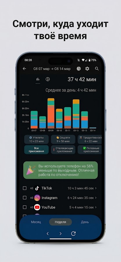 Смотри, сколько времени ты проводишь в каждом приложении каждый день.