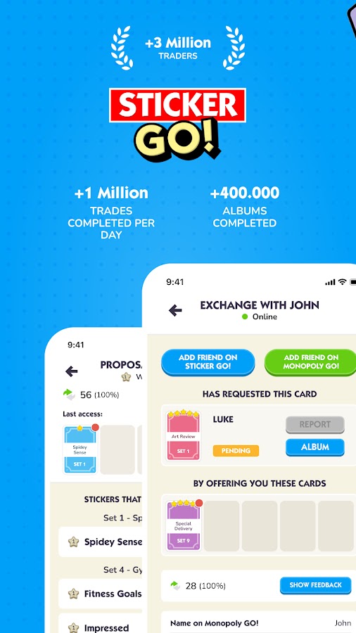Предлагайте обмены другим игрокам Monopoly GO! всего за несколько нажатий. С помощью системы обратной связи вы можете проверить надежность каждого пользователя и избежать нечестных обменов. Заполнение вашего альбома наклеек никогда не было таким безопасным!