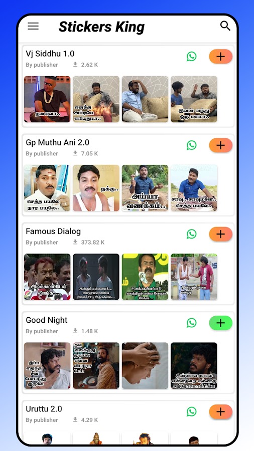 Попробуйте это приложение Stickers King: стикеры на тамильском языке — анимированные стикеры и стикеры vadivelu для WhatsApp и Telegram, в том числе более 1000+ анимированных наборов стикеров и тысячи стикеров Vadivelu! ТВ-шоу и фильмы, знаменитости и модели, ipl, забавные мемы, смайлики и так далее!