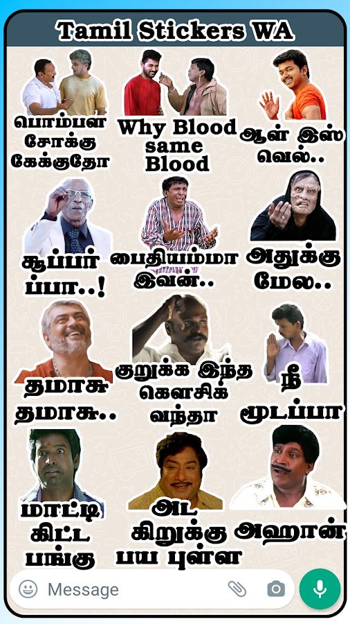 * Есть наклейки всех тамильских фильмов. Тамильская актриса, актеры, комики, фестивали, политика, спорт, все тамильские наклейки доступны.