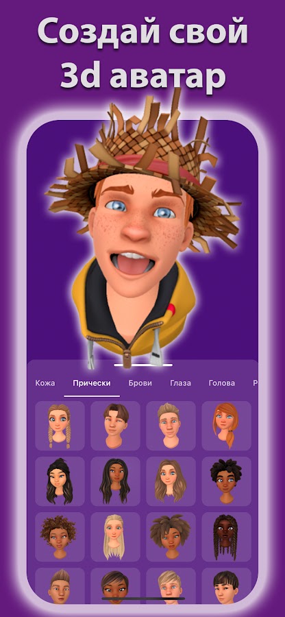 ★ Создайте своего собственного анимированного 3D-персонажа, подобно Emoji Me, SuperMe, Bitmoji, Facemoji, Faceapp, Memoji, Animoji, vmoji. Меняйте и настраивайте свой аватар на любой вкус. Кожа, прически, брови, глаза, волосы. Огромный выбор одежды: очки, головные уборы, короны, украшения, пирсинг, серьги, маски, ожерелья.