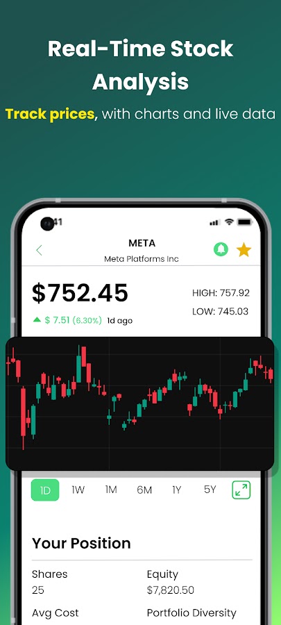 Изучайте статистику акций, профили компаний и финансовые новости. Просматривайте графики (1D, 5D, 1M, 1мин, 5мин и т.д.) с индикаторами и наложениями, чтобы отточить свои навыки инвестирования и торговли.