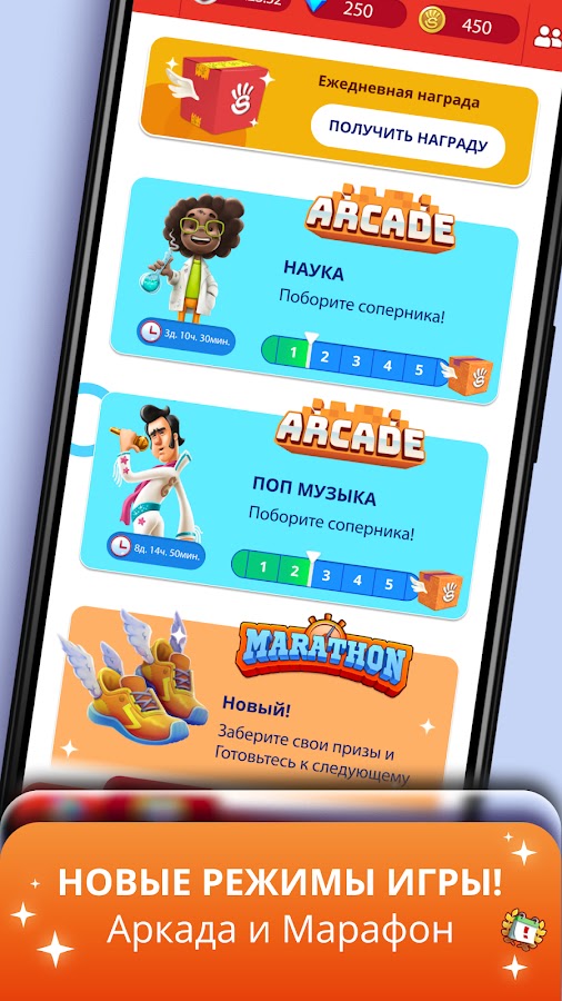 — Постоянно добавляемые категории, где нужно составлять слова из выпавших на экране букв и давать ответы на вопросы