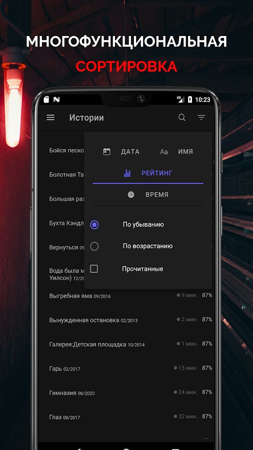 ☆ Сортировка: возможность сортировать страшилки по дате, рейтингу и имени