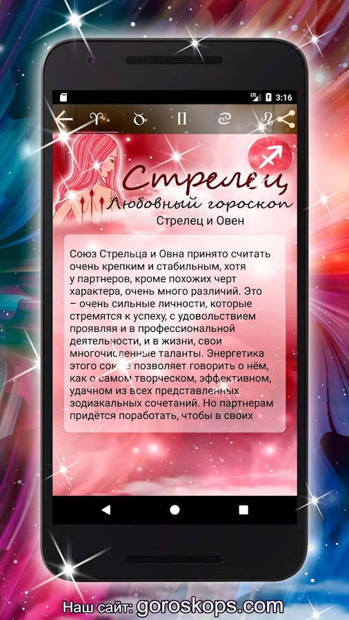 Стрельцы – тонкие ценители красоты, и наверняка вы оцените яркий дизайн нашего приложения. Мы уверены, что вы не оставите вне зоны своего интереса и столь полезную опцию, как гороскопы на видео. Надеемся, что всё это добавит задаст позитивный тон вашему дню и, следовательно, привлечёт к вам удачу.