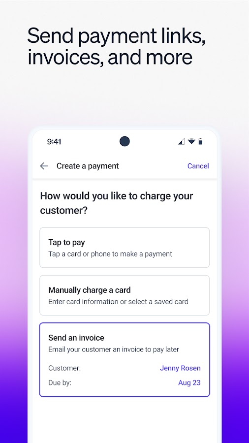 • Accept in-person payments manually or using Tap to Pay