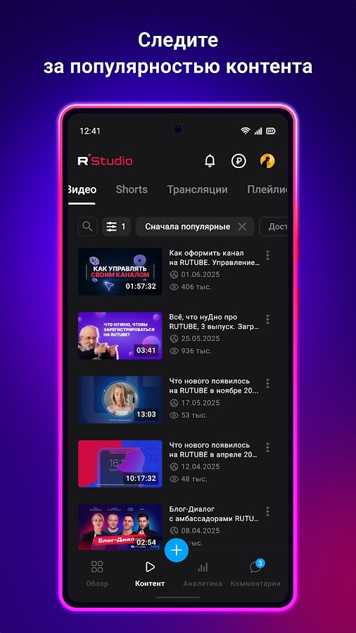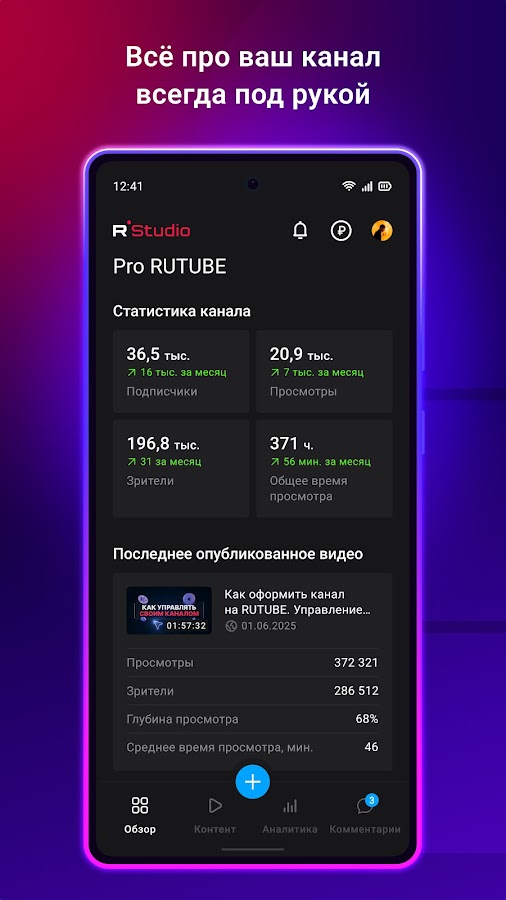 Студия RUTUBE — приложение, которое помогает блогерам общаться с аудиторией, работать с контентом, вести трансляции, а ещё анализировать статистику по каналу и каждому видео.