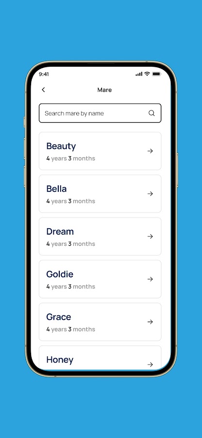 На экране «Кобылы» отображается список кобыл, добавленных администратором.