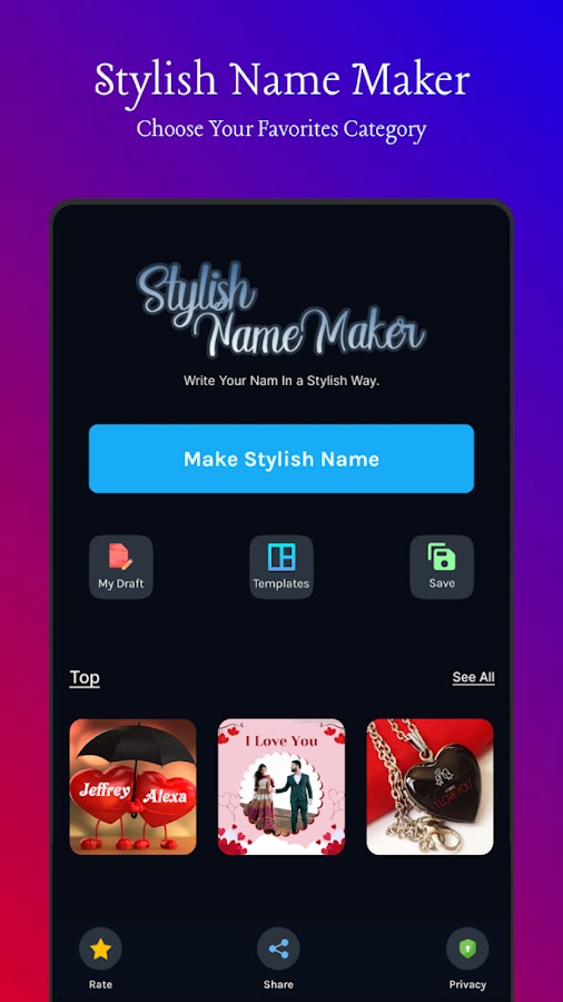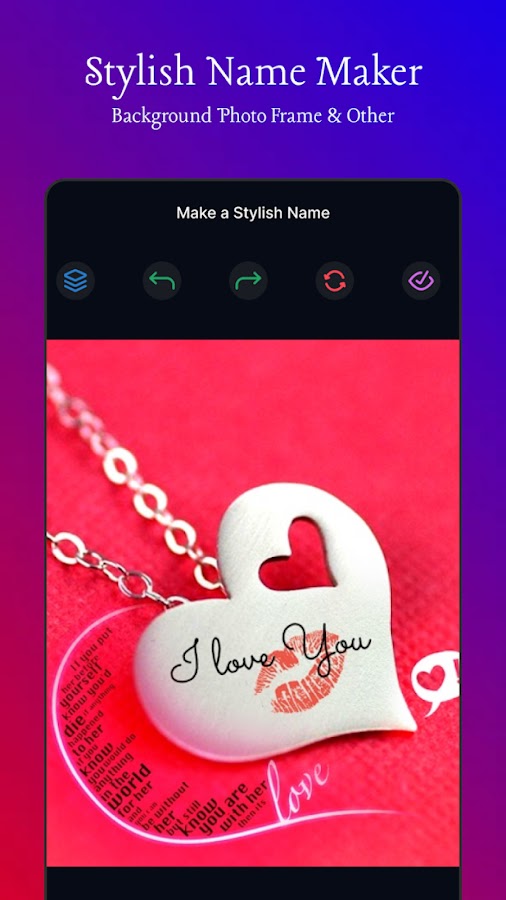 Приложение Stylish Name Maker — идеальное имя для приложения для создания картинок и имен. Теперь напишите свое имя, псевдоним с фантазией, уникальным и стильным на потрясающей коллекции фоторамок или фото фонов. Напишите имя своего любовника на руке и раскрасьте его. Приложение Stylish Name Maker — лучший и идеальный выбор, чтобы написать своему парню и девушке стильный вид, потому что приложение Stylish Name Maker — это бесплатное приложение для создания имен и псевдонимов. Поделитесь своим именем любовника с фэнтезийной стильной рамкой для фото перед свадьбой. Так что почувствуйте свою семейную жизнь с приложением Stylish Name Maker. Это эпоха искусства и моды. Люди фотографируют и делают селфи, но вы также можете провести свободное время с приложением лучшего художника Stylish Name Maker.
