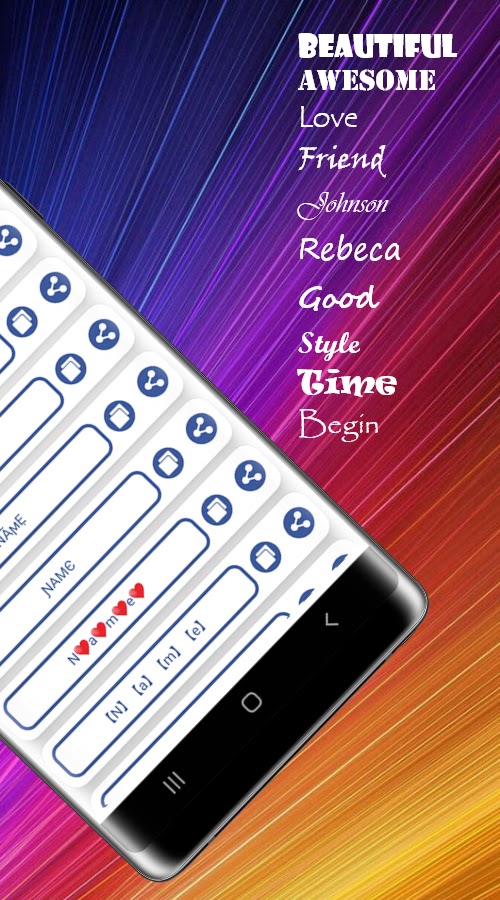 вы можете отредактировать свое любимое имя с помощью этого приложения, и оно будет отредактировано таким впечатляющим образом, что оно понравится вашему другу. это уникальное приложение, чтобы показать свои чувства уникальным способом. если вы хотите написать имя своего друга или свой псевдоним с помощью стильного текстового генератора с помощью стильного приложения для создания имен, так что этот стильный генератор имен идеально подходит для вас.