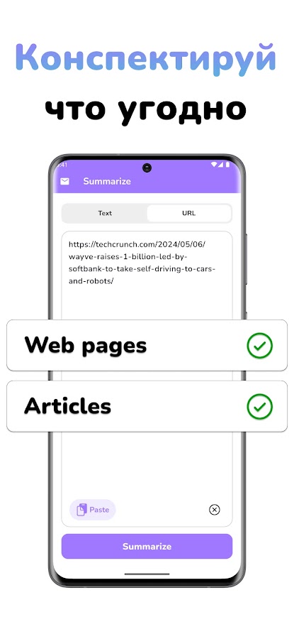 Our summarize app is the perfect solution for condensing lengthy texts, articles, or URLs into concise summaries with just a tap.