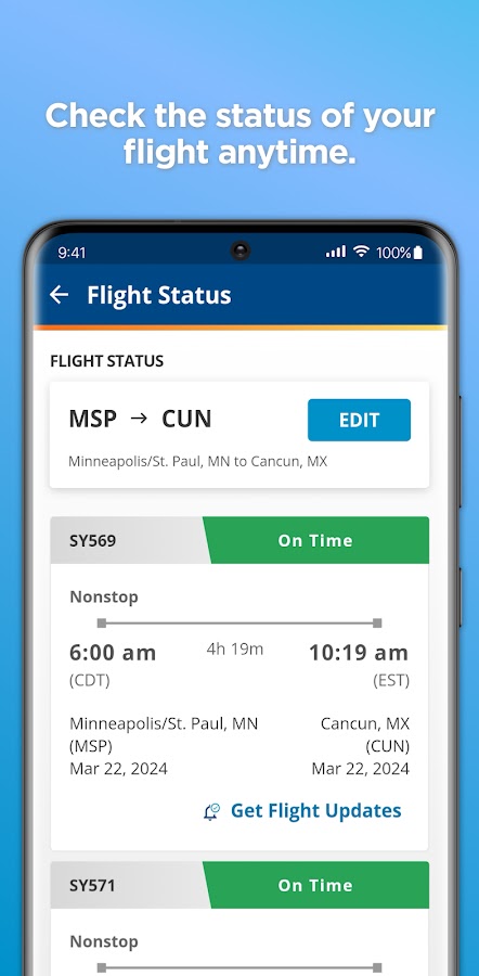 Приложение Sun Country Airlines поможет сделать ваше путешествие легким. Регистрируйтесь, получайте посадочный талон, управляйте поездками или бронируйте новые. Приступайте к делу.