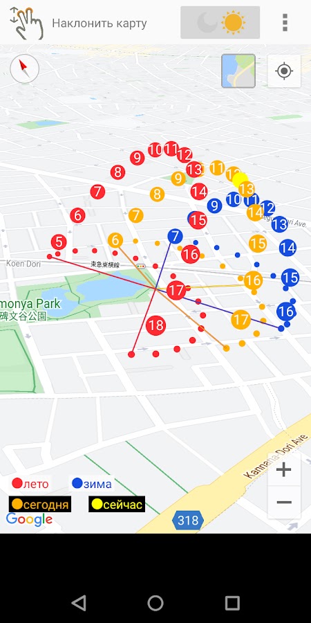 Вы также можете перейти в любое место в GoogleMap и отобразить траекторию солнца в этом месте в 3D.