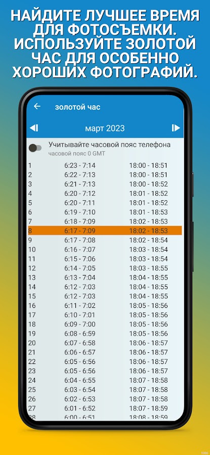 С помощью нашего приложения вы можете увидеть время восхода и восхода солнца для каждого места. Мы показываем вам продолжительность дня, а также время захода или восхода луны. Если вы фотограф, вас очень заинтересует золотой час. Это время, когда солнечный свет сияет краснее и мягче. Это делает фотографии особенно красивыми. Вы также можете получать уведомления о начале восхода или захода солнца.