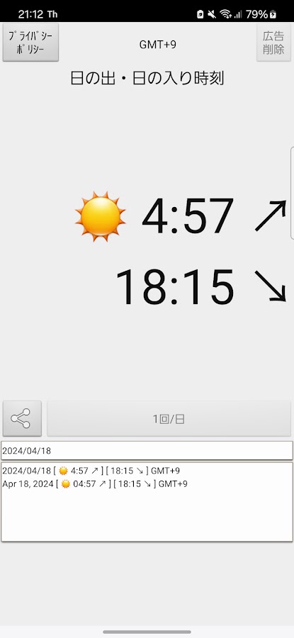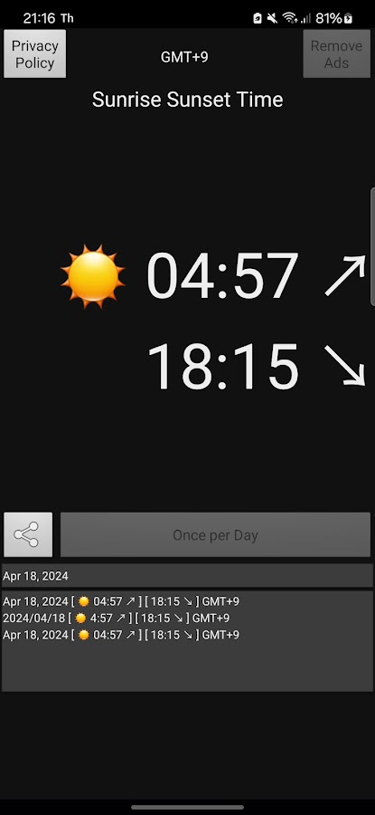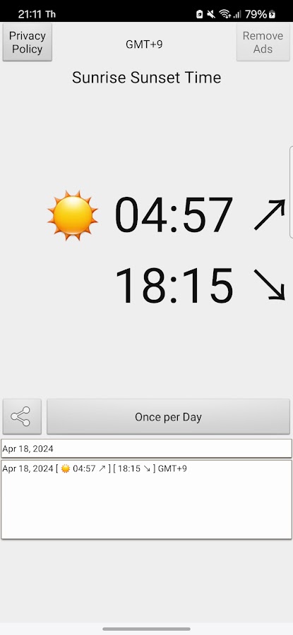Бесплатное приложение, которое отображает время восхода и захода солнца в текущем местоположении GPS-измерения. Часовой пояс текущего местоположения, сохранение истории восхода и захода солнца.