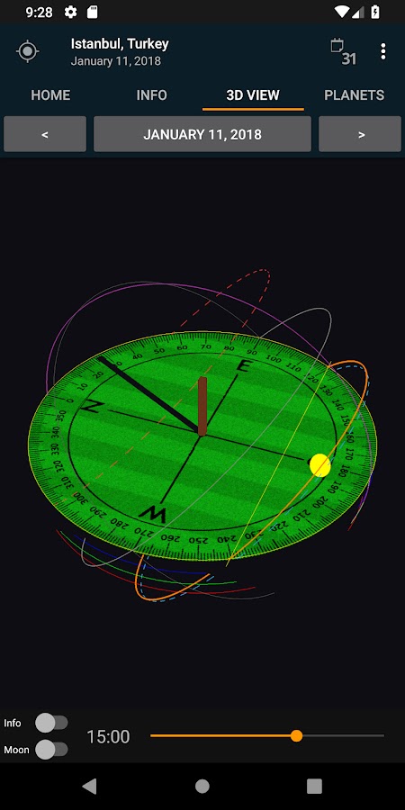 • 3D визуализация показа и объяснения путь солнца и продолжительности дня.