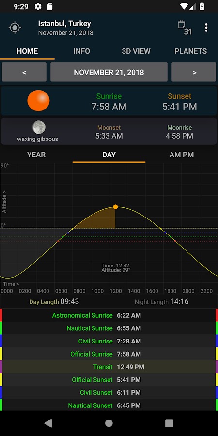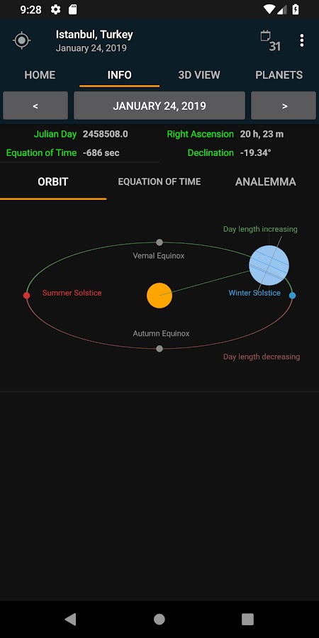 • Показывает транзитное время, продолжительность дня, Джулиан день, прямое восхождение (RA) и Склонение Солнца