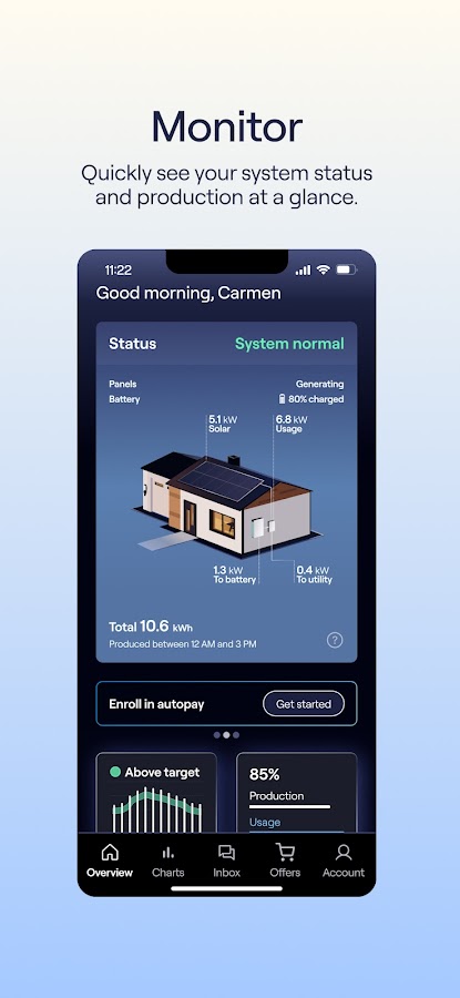 Наше приложение, недавно разработанное и простое в использовании, представляет собой единую точку доступа для клиентов Sunrun, позволяющую контролировать их системы, отслеживать выработку энергии, оплачивать счета и получать необходимую им поддержку.