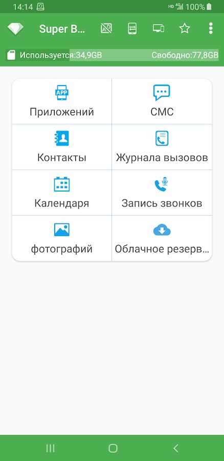 Вы можете создавать резервные копии приложений, контактов, SMS, журналов вызовов, закладок, календарей на SD-карту.