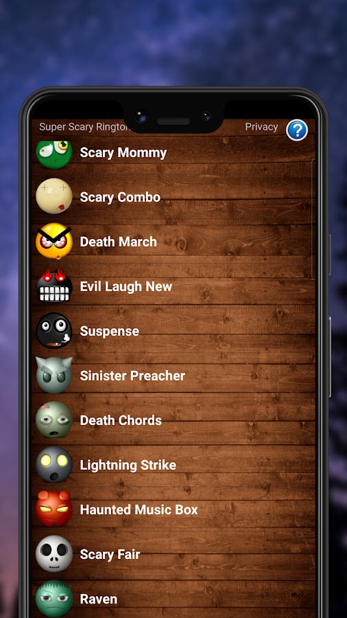 Супер страшные звуки включают в себя реалистичные страшные звуки, идеально подходящие для страшной мелодии звонка, уведомления или звука будильника. Коснитесь, чтобы выбрать страшную мелодию для звонка, и нажмите кнопку со страшной темой, чтобы воспроизвести звук. Нажмите зеленую галочку, чтобы сохранить мелодию звонка, она проста в использовании.