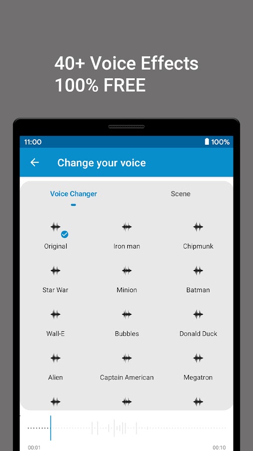 Изменитель голоса и Модулятор может изменить ваши голосовые записи и аудиофайлы с помощью более 40 звуковых эффектов и эффектов сцены, 100% БЕСПЛАТНО!💯. Вы можете превратить свой голос в эффекты супергероев, роботов, гелия, бурундука, ребенка, мужчины и женщины. И отправьте свой измененный голос в виде голосового сообщения или поделитесь им в социальных сетях!