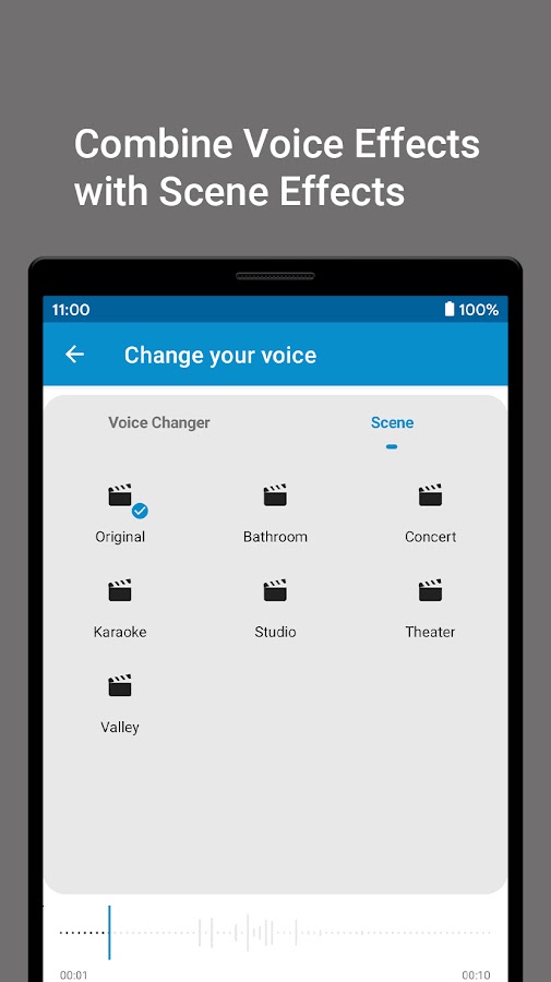 Вы можете комбинировать голосовые эффекты и эффекты сцены, чтобы создавать уникальные средства изменения голоса, такие как супергерои в ванной или роботы, поющие караоке.