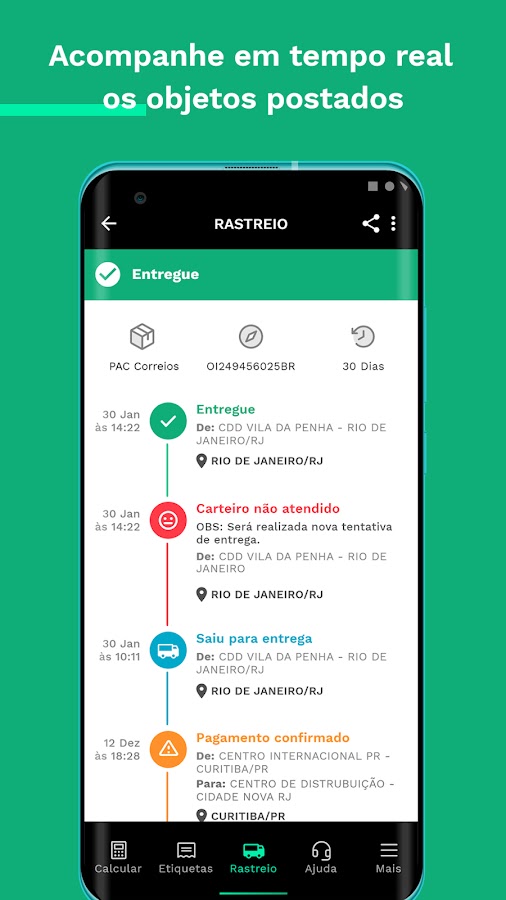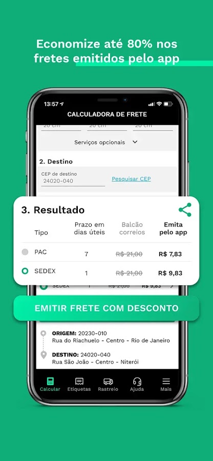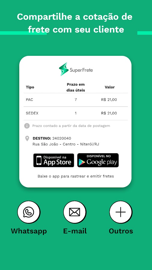 Рассчитайте время доставки и доставки для почтового отделения (Sedex, PAC и Mini Envios) для вашего клиента и оформите доставку до 80% дешевле по всей Бразилии менее чем за 1 минуту с помощью приложения SuperFrete.