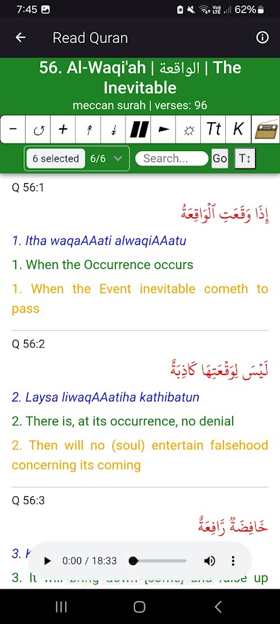 Сура «Аль-Вакиа» (сура 56 Священного Корана), также известная как сура «Аль-Вакиа» или сура «Аль-Вакиа», – одна из самых духовно сильных сур Корана. Это приложение поможет вам читать и слушать суру «Аль-Вакиа» офлайн с чётким арабским шрифтом, поаятовым аудио и несколькими переводами на выбранный вами язык.
