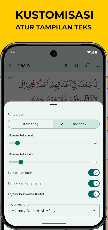 Использование арабского шрифта LPMQ Isep Misbah от Министерства религии Индонезии, чтобы его было более четко и легко читать.