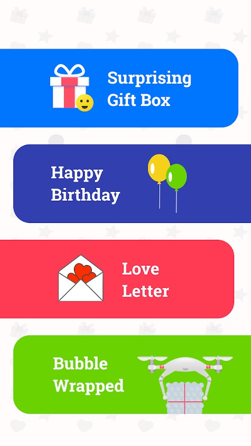 Приложение очень легкое на вашем устройстве и не требует никаких обновлений для добавления новых функций. Планируйте и отправляйте подарки нескольким получателям одновременно, добавляйте персонализированное сообщение за считанные секунды, чтобы пригласить друзей насладиться подарками.