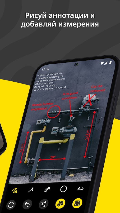 — Рисование и измерение: Добавляйте графические аннотации и измерения непосредственно на фотографии.