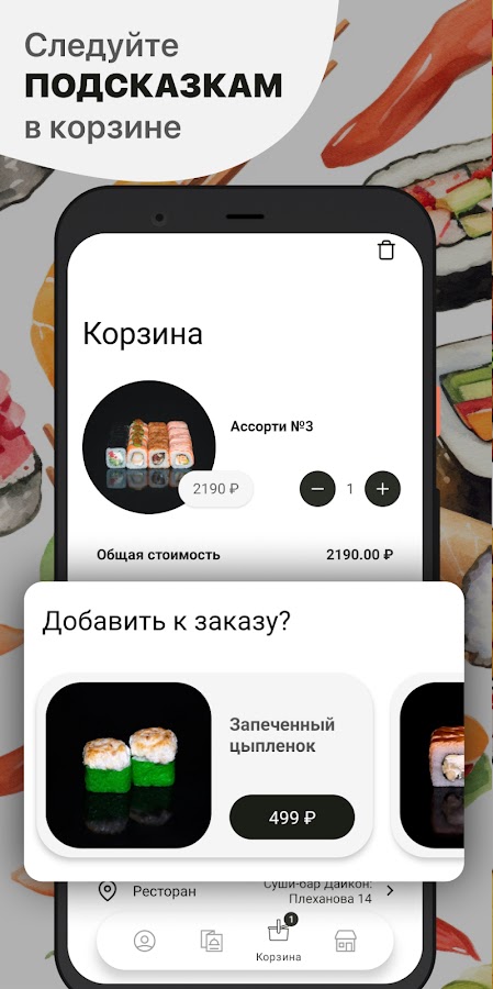 Как сделать заказ в приложении “Суши-Бар Дайкон”: выберите понравившиеся позиции из меню, добавьте их в корзину и перейдите на экран оформления заказа (по нажатию на иконку корзины).