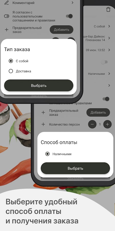 Выберите способ оплаты: Наличными или картой. Примите правила оплаты и нажмите кнопку “Заказать”.
