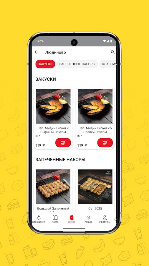 ✔ Большой выбор — суши, пицца, роллы, закуски и напитки от проверенных заведений.