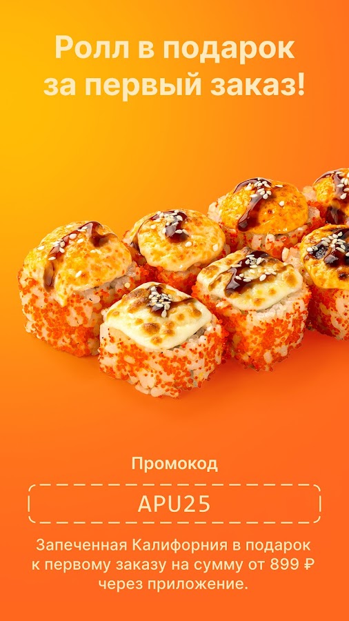 Ролл Запеченная Калифорния в подарок к первому заказу на сумму от 899 руб через приложение.