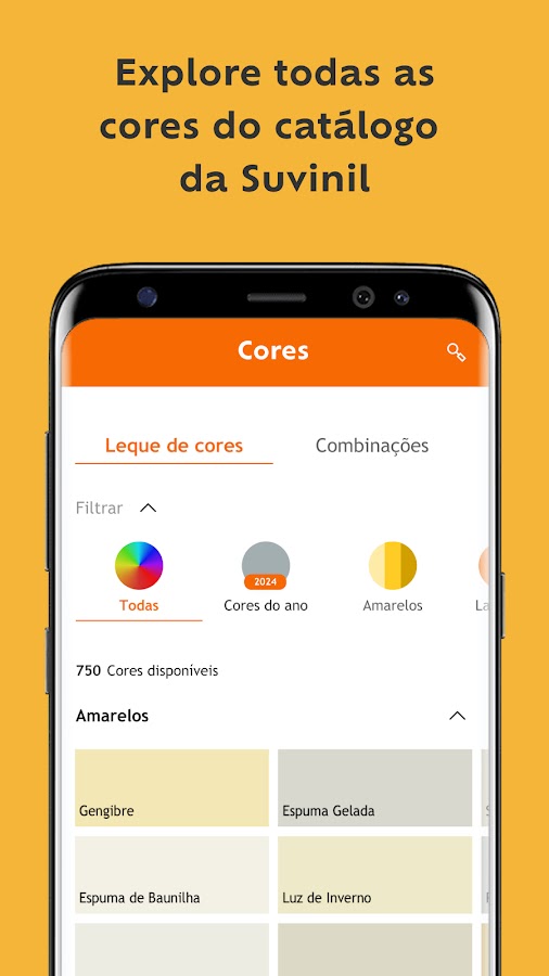 🧡 Цифровой веер Suvinil Paints: изучите наш каталог цветов, разделенных по основным тонам, таким как оранжевый, желтый, красный, синий, зеленый, серый и другие, или просмотрите ощущения и цвета моды, открывая новые возможности для росписи стен. Suvinil также позволяет легко вдохновить вас цветовыми сочетаниями, смоделированными нашими экспертами и архитекторами, которые уже использовали приложение Suvinil Teste Sua Cor.