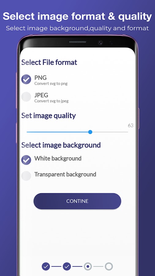 Конвертируя svg в jpg, png, вы можете установить качество изображения, а также изменить фон изображения на полностью непрозрачный белый или прозрачный. Вы можете поделиться преобразованным файлом, а также просмотреть все преобразованные изображения в приложении.