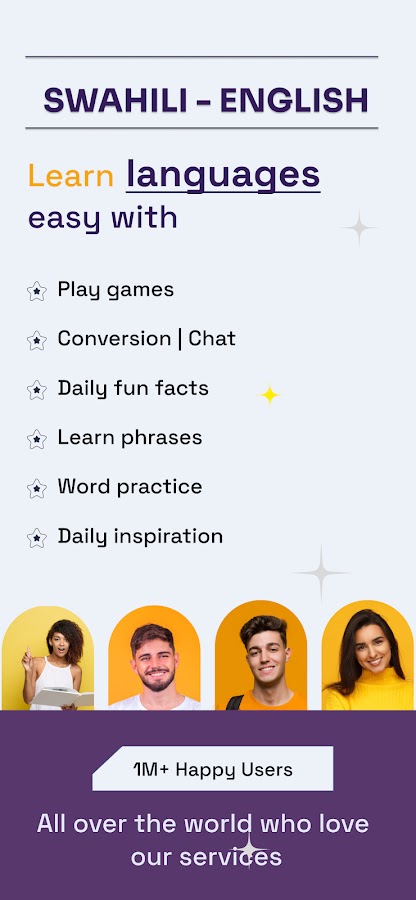 Каждый день вы получаете слово дня, чтобы расширить свой словарный запас и улучшить свой английский. Вы можете выучить английский язык очень быстро и легко с вашего языка суахили это приложение (словарь суахили). Словарь содержит слова со значением, определением, примером использования и антонимами. Это приложение (словарь суахили на английский) Ежедневно произносите общие предложения, чтобы улучшить свой разговорный английский тоже. Словарь суахили всегда уведомляет, чтобы ежедневно узнавать новые слова и предложения, которые он отличает от других учеников. Это приложение (словарь суахили) имеет функцию распознавания текста, которая может легко идентифицировать текст из изображений.