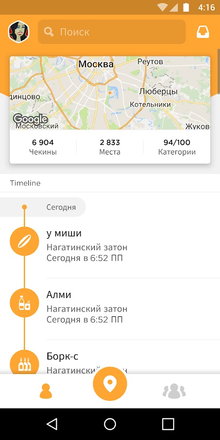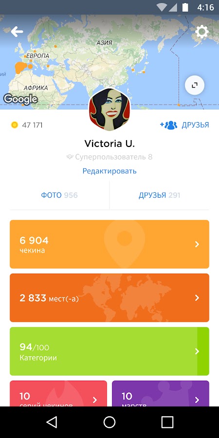 • Тепреь рассказывать о своей жизни стало еще проще. Мы будем оставлять метки на карте при каждом чекине, и ты сможешь просматривать места, где тебе довелось побывать. Помоги себе: добавь к чекину фото или заметку, чтобы скорее вспомнить этот день.