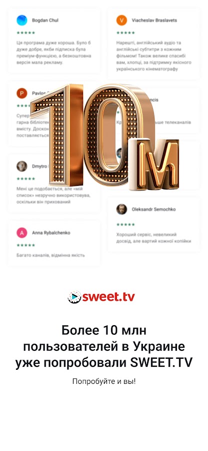 Ищете универсальное приложение, чтобы смотреть фильмы, сериалы и телеканалы вроде Disney, Sony, Paramount и Universal? Добро пожаловать в SWEET.TV — приложение, которое позволяет смотреть новинки кино, любимые шоу, программы, мультики и многое другое на 4 устройствах одновременно. Более 200 телеканалов в прямом эфире, тысячи фильмов и сериалов, премьеры сразу после показа в кино — SWEET.TV собрал для вас всё, чтобы отдыхать, смотреть фильмы вместе с любимыми и быть в курсе последних новинок.