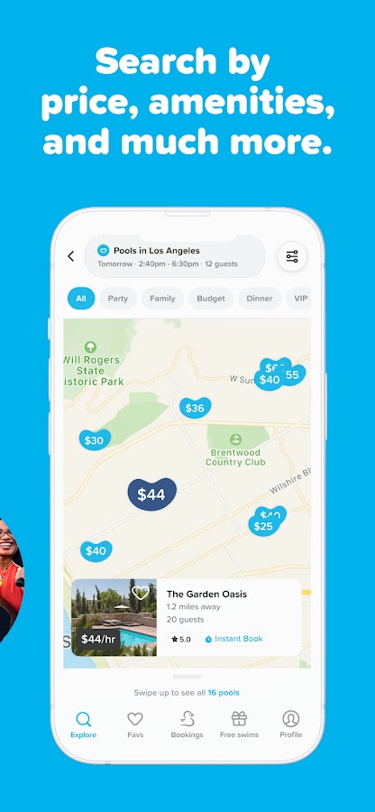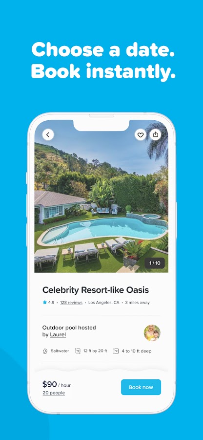Swimply позволяет легко забронировать красивые частные пространства на открытом воздухе на нужное вам время. Планируете ли вы вечеринку у бассейна, плавание с собакой, свидание, тренировку, фотосессию или расслабляющий отдых в одиночку, Swimply предлагает тысячи невероятных мест поблизости.