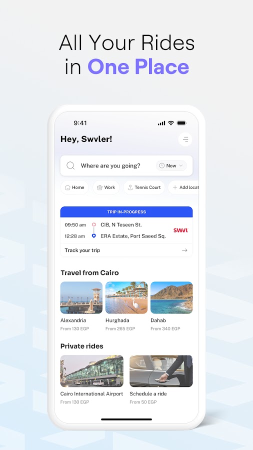 Благодаря Swvl все ваши ежедневные и туристические поездки доступны одним нажатием кнопки. Будь то быстрая поездка по городу или поездка на дальние расстояния, вы можете легко просматривать доступные поездки, выбирать маршрут и просматривать расписание станций — и все это в одном приложении.
