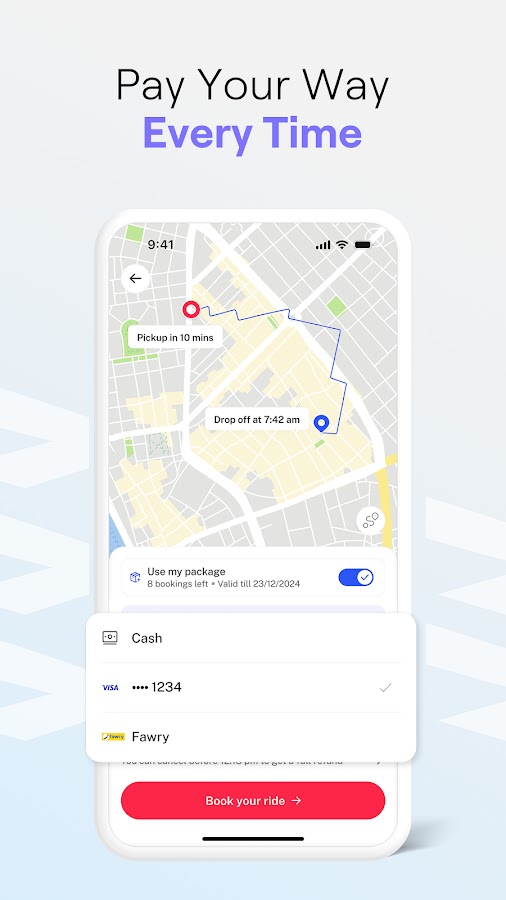Swvl предлагает несколько вариантов оплаты в соответствии с вашими потребностями. Оплачивайте безопасно с помощью кредитной/дебетовой карты, мобильного телефона или наличными. Гибкие способы оплаты Swvl позволяют легко управлять поездками по своему усмотрению.